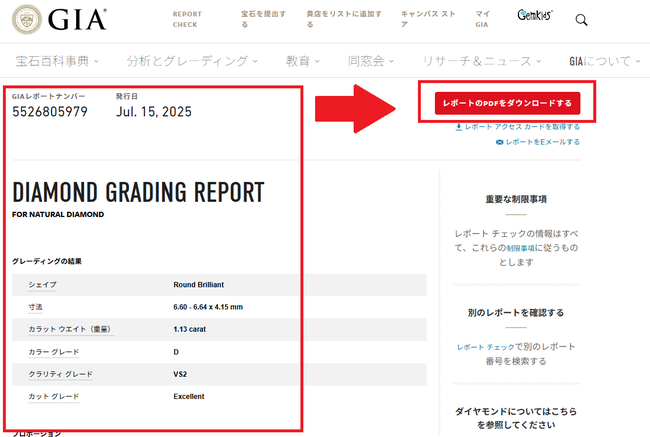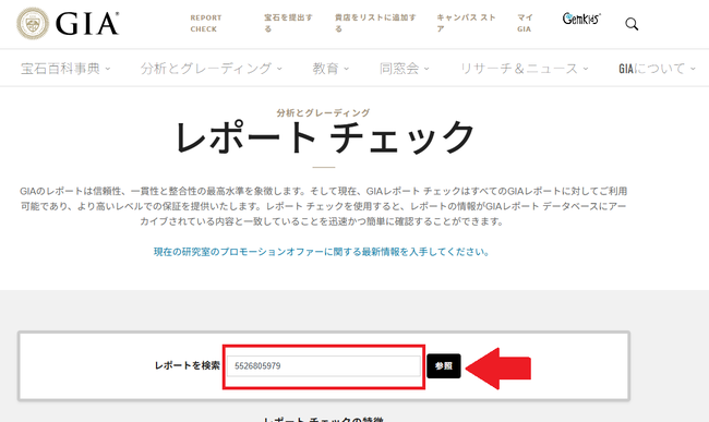 赤枠の欄に鑑定書番号(= ガードル刻印番号)を入力すれば、いつでもご自身のダイヤモンドの鑑定結果が閲覧可能です。