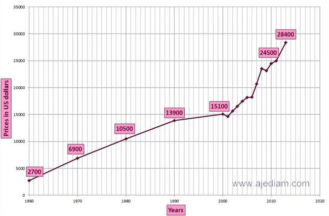 上記表を見るとゆるやかに右肩上がりで上昇、2000年以降はデビアスの価格コントロールを止めたので、急激に上昇しています。